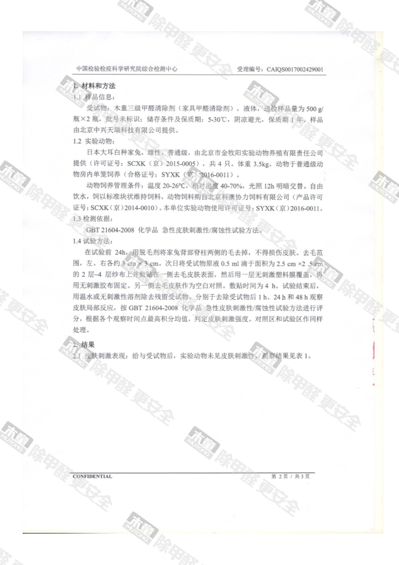 木童家具甲醛清除劑皮膚安全性檢測報告